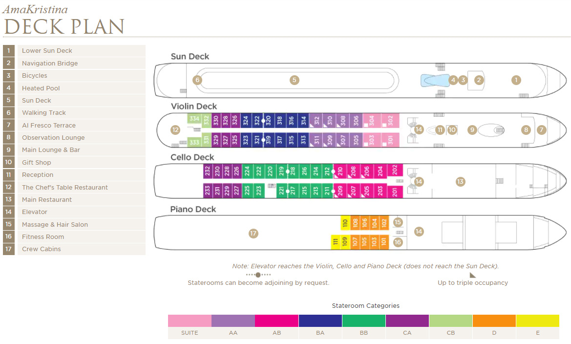 | CATEGORY | DECK | STATEROOM | CRUISE ONLY | EARLY BOOKING CRUISE ONLY | PARIS TO DIJON & LYON (4-NIGHT) PRE-CRUISE TOUR ADD | AIX-EN-PROVENCE (3-NIGHT) POST-CRUISE TOUR ADD |