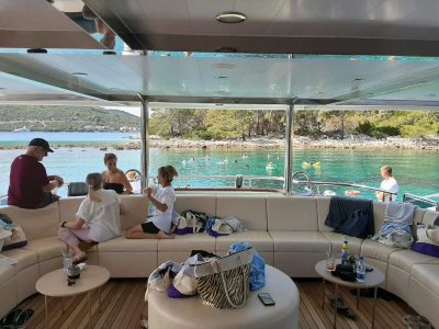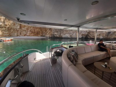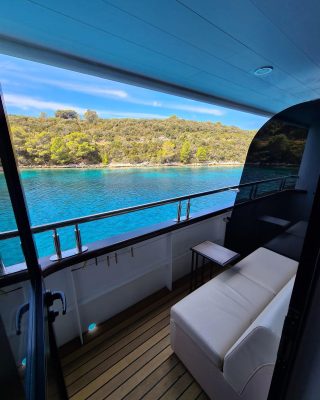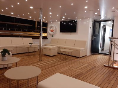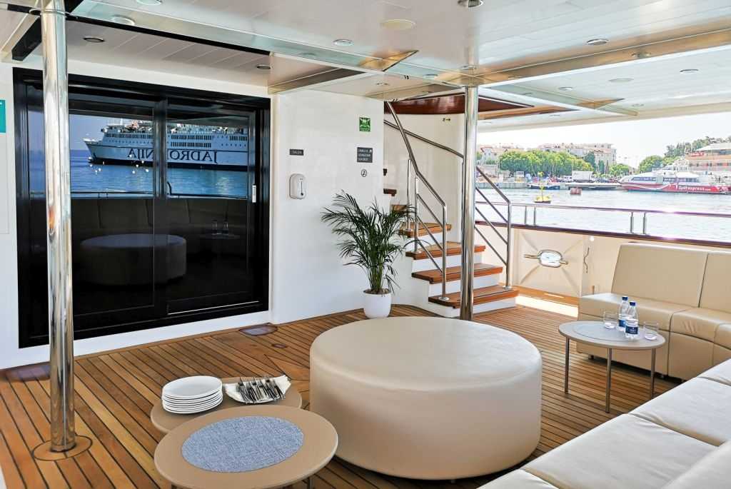 Main salon with dining area, bar and lounge area with smart TV, radio. There is also a lounge bar on the top deck. This vessel does not have an elevator however all decks are accessible via forward & aft staircases.