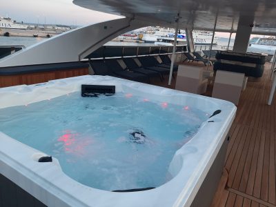 - Large sundeck with a bar, rooftop jacuzzi, deck chairs and sun loungers
