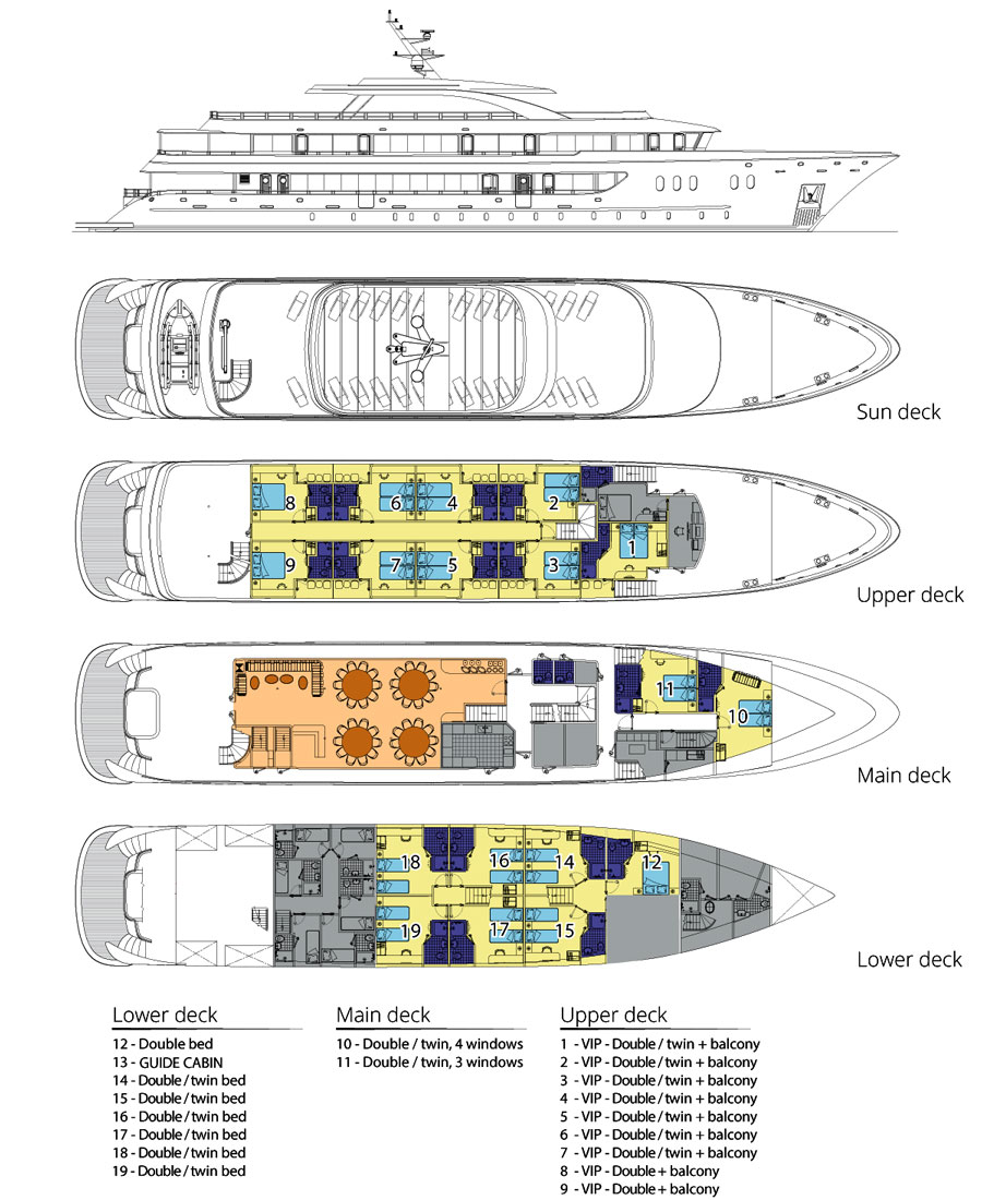 | LOWER DECK | 8 cabins, 177-188 square feet | $7,745.00 | $7,495.00 | $12,694.00 |